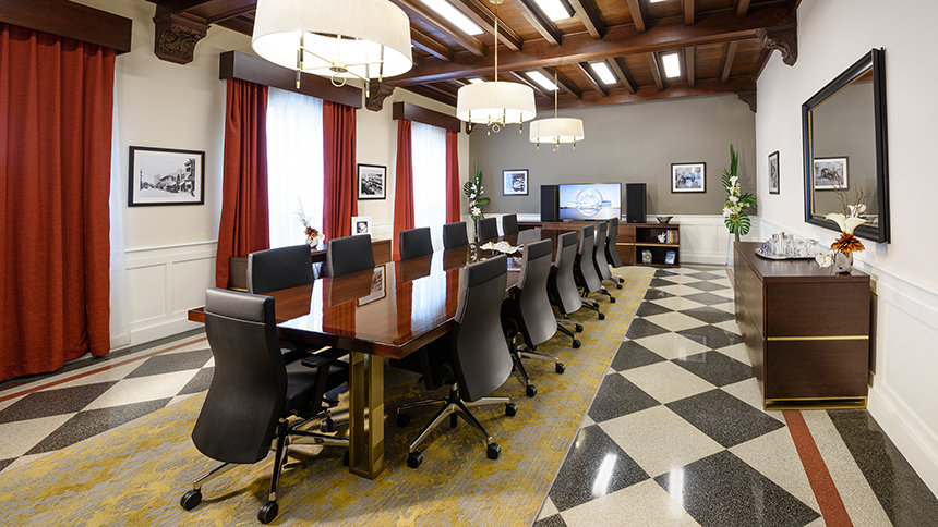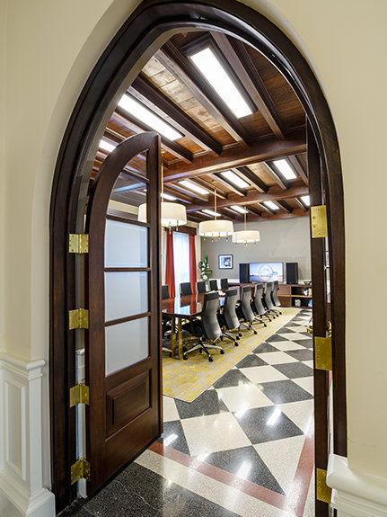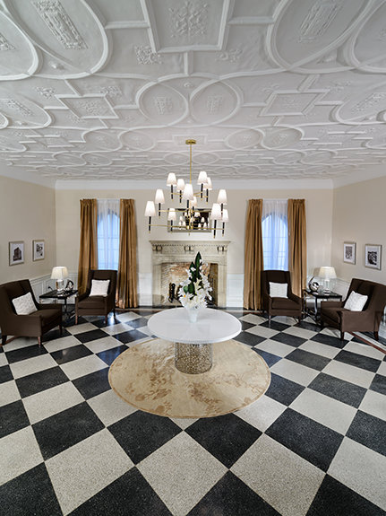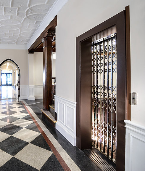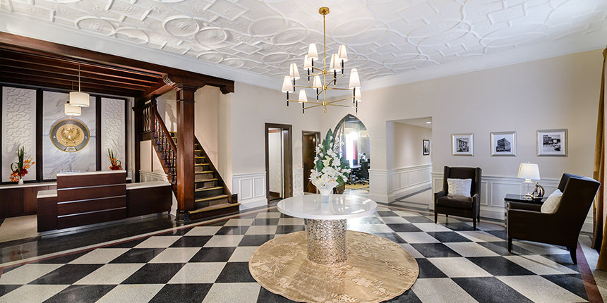 Historische Elemente des West-Coast-Gebäudes wurden sorgfältig wiederhergestellt, von der charakteristischen Fassade und den dekorativen schmiedeeisernen Fenstergittern bis hin zu den neuen Fenstern mit 12 Scheiben und von den ursprünglichen Terrazzofußböden und Mahagonideckenbalken des eleganten Foyers bis hin zum grünen Ziegeldach und den Außenmarkisen.