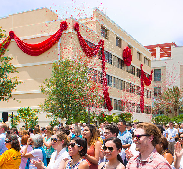 Die versammelte Menschenmenge feierte die Eröffnung des West-Coast-Gebäudes (WB) und des Flag-Crew-Verwaltungsgebäudes (zuvor als das Lee-Arnold-Gebäude bekannt).
