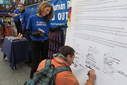 Amina Mustafa Keogh beschrieb dann auch die landesweite Bewegung, die in den vergangenen 12 Monaten unter dem Banner von United for Human Rights hervorgebracht wurde: „Jedes Mädchen und jeder Junge in unserem Unterrichtsprogramm ,Count Us In‘ (,Wir sind mit dabei‘) erhält im Zusammenhang mit unserem Anti-Mobbing-Workshop ein Exemplar Ihres Menschenrechtshefts. Tatsächlich setzen 48 unserer ehrenamtlichen Helfer von Cork bis nach Limerick und von Galway bis nach Dublin das Programm ein. Sie geben gemäß dem Pädagogenkit Seminare und Vorträge und säen den Samen der Menschenrechte, wo auch immer sie hingehen. Und da fast 3000 Schüler das Programm bereits absolviert haben, bauen wir eine ständig wachsende Menschenrechtsbewegung auf.“