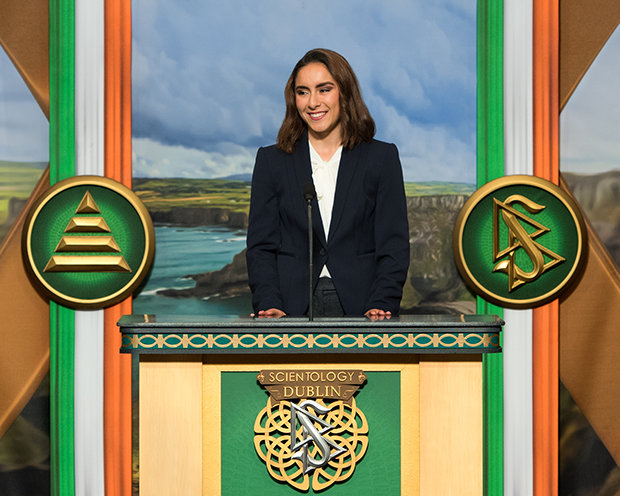 „Also auf das ewige Irland, das transzendente Irland: Du hast die Literatur über 500 Jahre lebendig gehalten. Du hast Amerika aufgebaut und möglicherweise sogar entdeckt. Du hast der Menschheit Gleichberechtigung beigebracht und ebenfalls, wie man auch in ihrer Abwesenheit würdevoll leben kann. Und du hast uns beigebracht, dass es nichts gibt, das ebenso wertvoll ist wie die Schönheit, für die du ein Inbegriff bist. Aufgrund all dessen sind wir stolz, dir nun zur Seite zu stehen, indem wir diese neue Scientology Kirche mit ihrem Gemeindezentrum für Dublin eröffnen.“