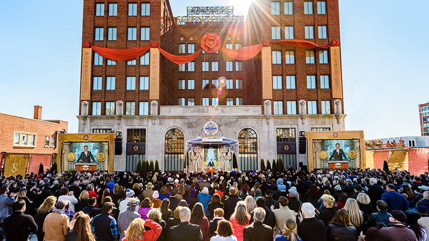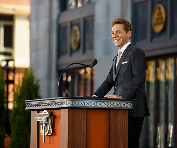 Mr David Miscavige, das kirchliche Oberhaupt der Scientology Religion, leitete die Einweihungszeremonie. In seiner Eröffnungsansprache unterstrich Mr Miscavige den heiteren Geist des Tages zu Ehren des neuen Zuhauses der Kirche für den Mittleren Westen: „Kansas City, wo, wie man sagt, die Menschen das reinste ‚Amerikanisch‘ in allen 50 Staaten sprechen und das Barbecue so gut ist wie nirgendwo sonst in der gastronomischen Galaxie. Dies ist auch eine Stadt, wo ‚Arbeitsethos‘ noch immer ist, was es war, bevor das Wort ‚Ethos‘ seine Bedeutung verlor. Also, ja, Kansas City, hier kommen wir!“