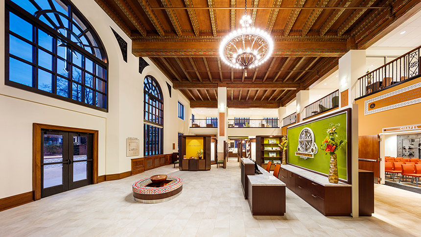 Die prächtig restaurierte Anlage, die 1926 erbaut wurde, ist ein Wahrzeichen der Stadt und ein denkmalgeschütztes Gebäude von nationaler Bedeutung. Sein durch und durch amerikanisches Beaux-Arts-Design und das symmetrische Äußere ist typisch für wichtige Gebäude des frühen 19. Jahrhunderts, die amerikanische Städte noch heute prägen. Das Kernstück ist ohne Frage die zweistöckige Eingangshalle im Erdgeschoss, die mit fünf einzigartigen Marmortypen verziert ist, sowie von Hand bemalten Deckenbalken mit einem von den Azteken inspiriertem Design und einem Kronleuchter riesiger Ausmaße aus Messing und Schmiedeeisen – es bietet einen spektakulären Empfang in einer Kirche, die engagiert ist, ihrer Gemeinde Auftrieb zu geben.