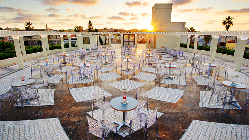 Das Scientology Zentrum hat ferner eine Dachterrasse und ein Café. Eingerahmt von einem ovalen Säulengang, bietet es einen weiten Blick auf das historische Zentrum von Jaffa.