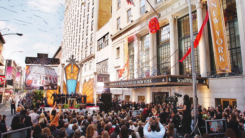 Die Scientology Kirche in New York City, die sich gleich neben dem Times Square befindet, war ein Geschenk der International Association of Scientologists für die Menschen von New York in Anerkennung ihres Muts und ihrer Energie angesichts der World-Trade-Center-Katastrophe im Jahr 2001.