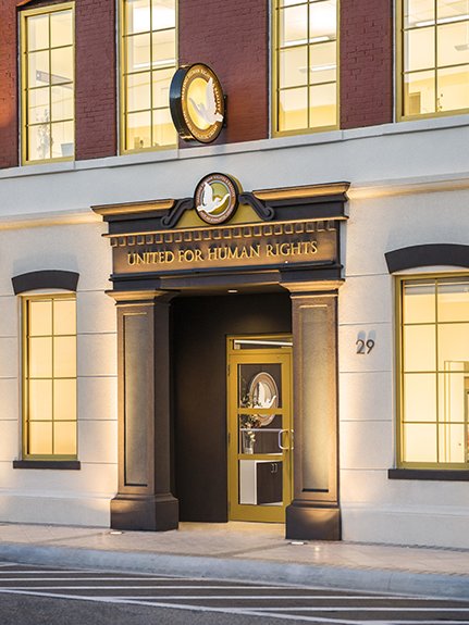 Das neue Center von United for Human Rights an Clearwaters Hauptdurchfahrtstraße, der Fort Harrison Avenue, steht nun als Hauptquartier für die Verwirklichung der Menschenrechte zur Verfügung. Es stellt einen standhaften Einsatz für breit angelegten Unterricht und breitgefächerte Information bezüglich der Menschenrechte im Bereich der Tampa Bay dar.