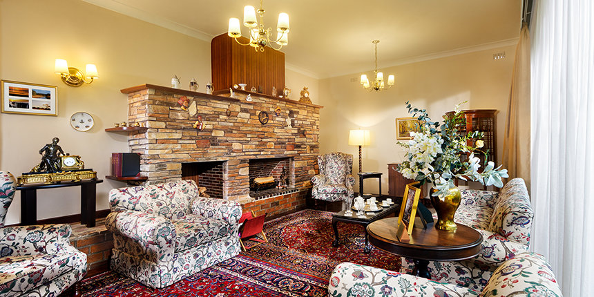 Draußen präsentiert sich der Pool in seiner klassischen Form und leuchtendem Türkis. Doch es ist der Steinkamin im Inneren, der vielleicht am atemberaubendsten ist – sowohl wegen seiner Schönheit als auch wegen seiner bemerkenswerten Reise. Ein späterer Besitzer hatte ihn abgebaut und die Steine für eine Gartenmauer wiederverwendet. Jetzt wurden sie von Restaurierungsexperten geborgen, von Hand gereinigt und pflichtbewusst in ihre ursprüngliche, exquisite Form zurückversetzt – warme Beobachter unzähliger Geschichten, bereit, all jenen, die dieses Wahrzeichen besuchen, diese Momente zu offenbaren.