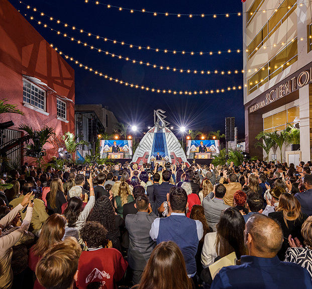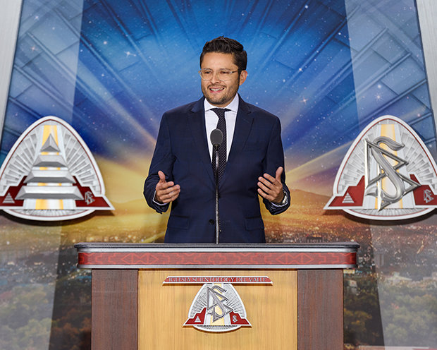Dieser deutlichen Einladung wurde Nachdruck verliehen, als Mr David Miscavige, das kirchliche Oberhaupt der Scientology-Religion, die Bühne betrat, um sich an alle Anwesenden zu wenden. „Vergessen Sie nicht den Kern und die Lebenskraft einer Idealen Org, wie unser Gründer es sich ausgemalt hat: ‚Eine Unternehmung, wo Leute hinkämen, um Freiheit zu erreichen, und wo sie die Zuversicht hätten, dass sie sie erreichen würden.‘ Genau das feiern wir heute. Es ist das Geschenk, das Sie machen. Und die Vision, die von Ihnen, den Helden dieser Bewegung, durch die Schaffung dieser Idealen Org wahr gemacht wurde“, sagte Mr Miscavige. „Möchten Sie sehen, wie in dieser lateinamerikanischen Megacity Geschichte geschrieben wird? Nun, der Augenblick ist gekommen – hier und jetzt.“