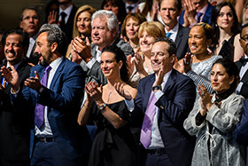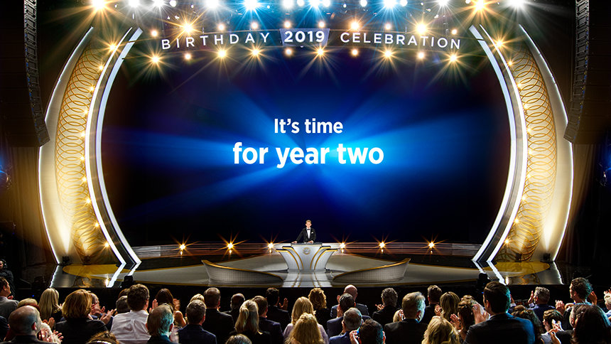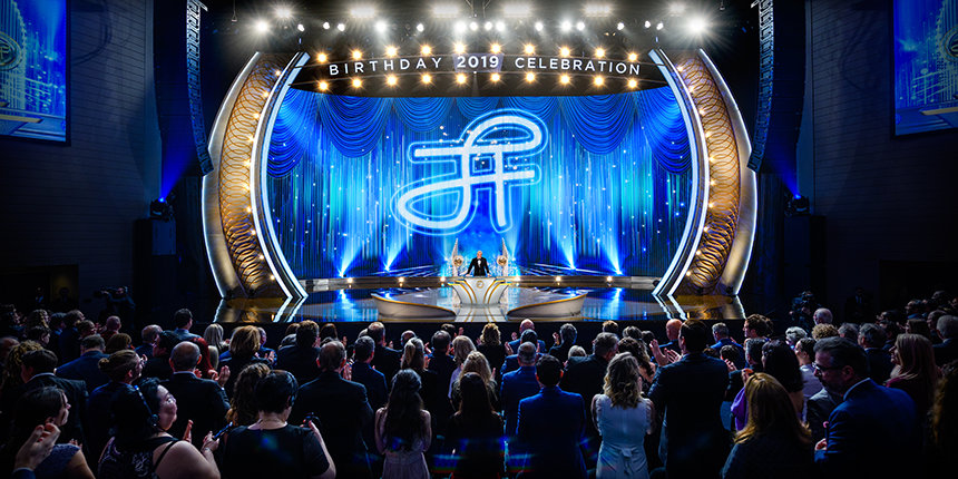Der Abend gelangte dann im Schnellvorlauf zu 2019 und einer Preisverleihung, die den Geist des Abends unterstrich – eine Feier der Expansion. Vor mehr als vierzig Jahren wurde LRH gefragt, was er sich zum Geburtstag wünsche. Seine Antwort war das Geschenk, dass Scientology Orgs und Missionen im Namen der Erbringung spiritueller Freiheit gedeihen. Im Laufe der Jahre haben Scientology Kirchen rund um die Welt ein Spiel daraus gemacht und wetteifern in einer von vier Ligen. Die diesjährigen Meister haben alle rekordverdächtige Leistungen vollbracht. Dabei handelt es ich um die Scientology Mission von Ulm, Deutschland; die Scientology Kirche in Stuttgart, Deutschland; die Fortgeschrittene Organisation und Saint Hill Großbritannien; und das Kontinentale Verbindungsbüro von Europa.