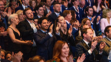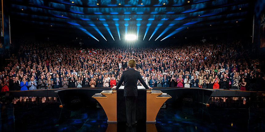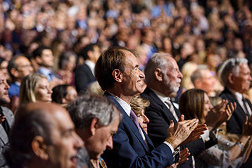 Die Bedeutung dieses Abends der grenzenlosen Feier wurde offensichtlich, als Mr David Miscavige, das kirchliche Oberhaupt der Scientology-Religion, unter der ersten von unzähligen stehenden Ovationen, die das Auditorium erschütterten, die Bühne betrat. Daraufhin nahm er die Menge von Tausenden mit auf eine zweieinhalbstündige Odyssee, die nicht nur LRHs Weg der Forschung und Entdeckung folgte, sondern auch unaufhörlich seinen bleibenden Einfluss betonte.