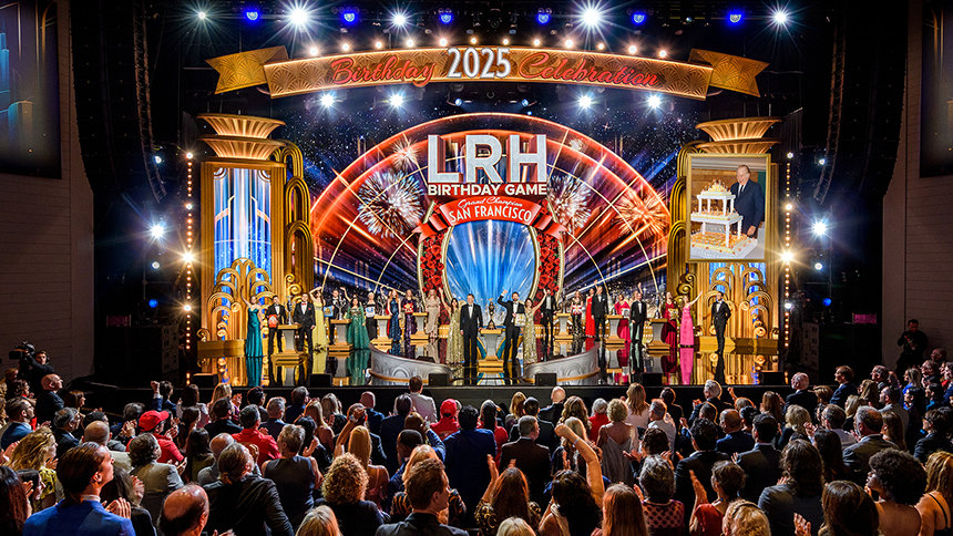 Sie haben also den Kern einer Geburtstagsfeier erreicht, die die ganze Welt miterleben darf“, fuhr Mr Miscavige fort. „Denn ohne zu hoch zu greifen und es unnötig auszuschmücken ... ist es eine Tatsache, dass LRH heute Abend überall ist.“