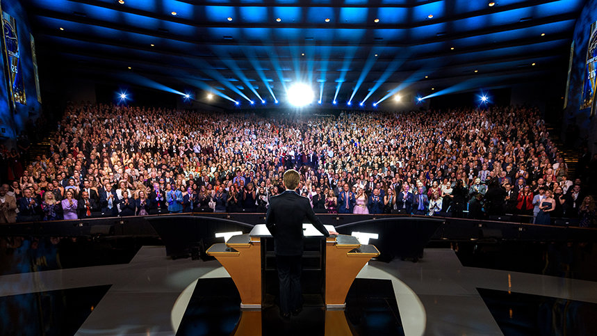 Der Abend begann mit einer donnernden Standing Ovation, als Mr David Miscavige, das kirchliche Oberhaupt der Scientology-Religion, die Bühne betrat und den Ton für das Kommende angab.