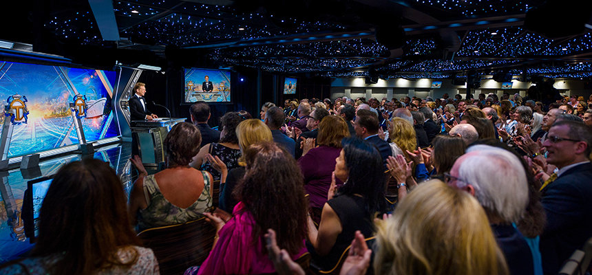 „Gemäß nautischer Tradition ist dies der Orientierungsabend, da wir unser Gestirn anpeilen und den Kurs für die kommende Woche festlegen“, begann Mr David Miscavige, kirchliches Oberhaupt der Scientology Religion. „Und im Laufe dieser Woche werden Sie Zeuge einer seismischen Welle künftiger Scientology Kirchen, die aufsteigen, um zu verkünden: Lasst die Inseln zum Meer werden.“