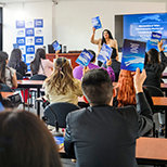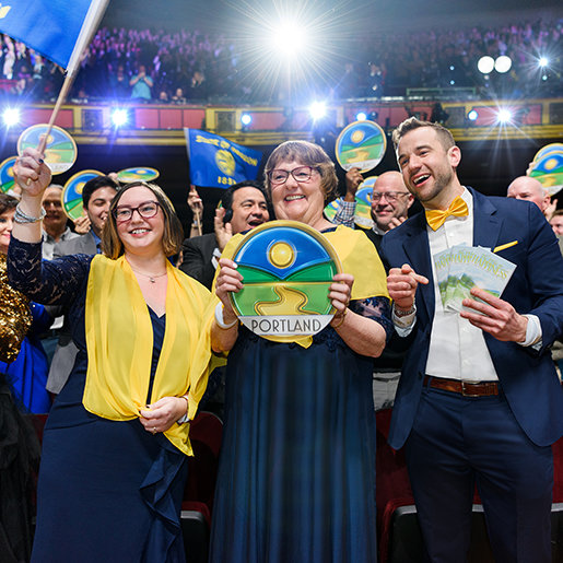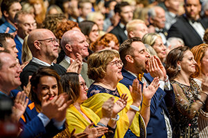 Das Publikum ist für einen donnernden Applaus wieder auf den Beinen aufgrund der Neuigkeit, dass Führungsteams bald das Ausbildungsprogramm abschließen und in ihre Organisationen zurückkehren werden.