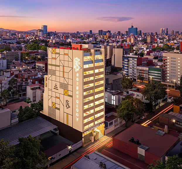 VIVA LA MEXIKO Die künftige Scientology-Kirche Del Valle erhebt sich zwölf Stockwerke über eines der kulturell lebendigsten Gebiete von Mexiko-Stadt und ist ein Leuchtfeuer der spirituellen Freiheit. Ihr über zwanzig Meter hohes Schild begrüßt jeden im Umkreis mehrerer Meilen.