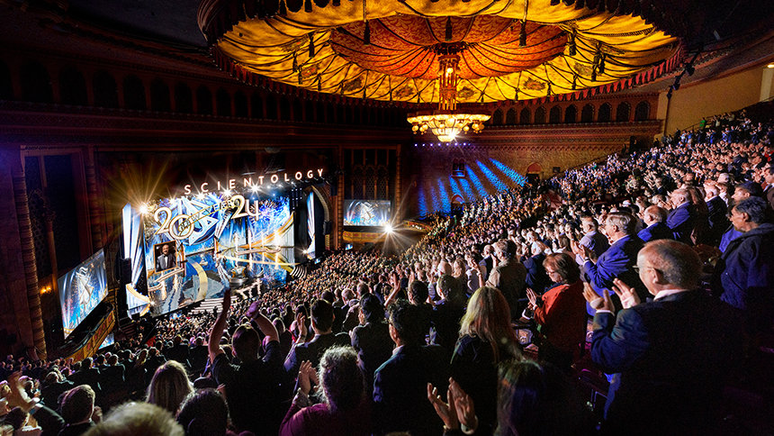 Die Pracht des Shrine Auditoriums in Los Angeles bildet den Rahmen, als eine Menschenmenge von über 6500 Scientologists und Gästen sich im voll besetzten Saal für die spektakuläre Neujahrsfeier der Scientology-Kirche versammelt.